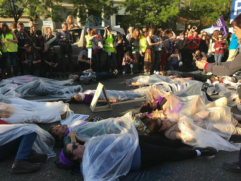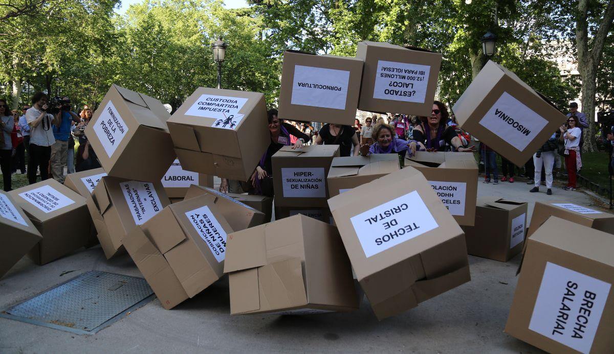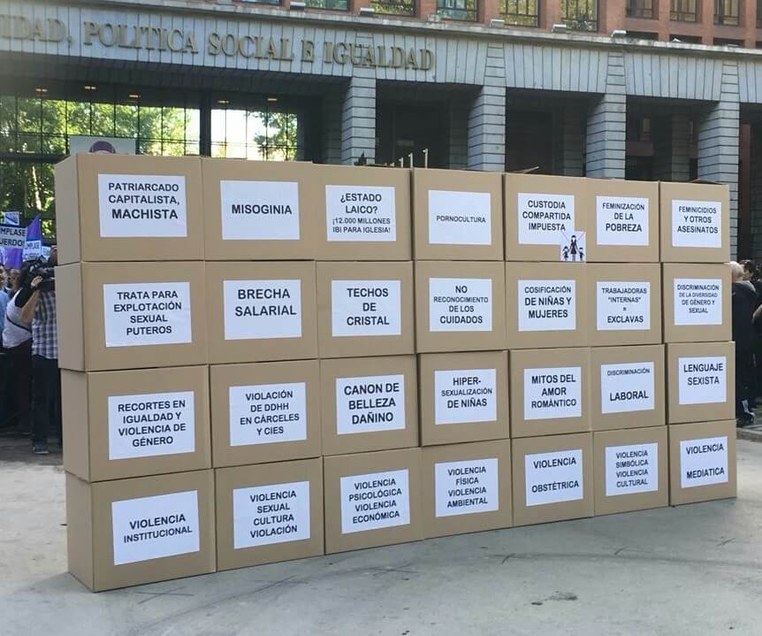 En Madrid, la manifestación que comenzaba con una acción delante del Ministerio de Sanidad, Servicios Sociales e Igualdad en la que se derribaba un muro simbólico de todos los obstáculos que nos encontramos en la lucha por la igualdad y culminó con una performance delante del Congreso.